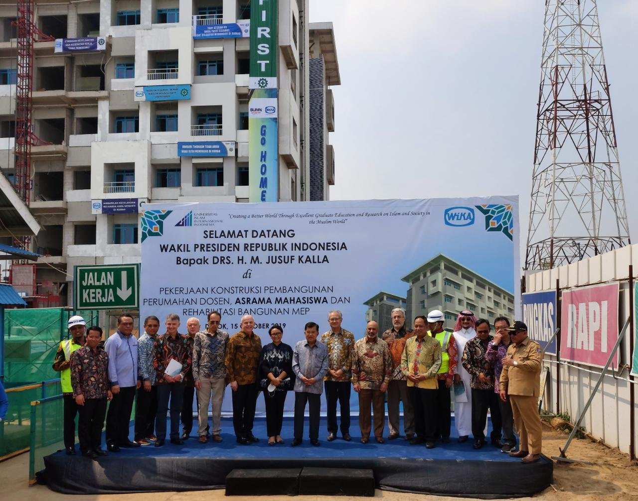 Wakil Presiden didampingi oleh Menteri PAN dan RB / Wakil Ketua Umum DMI Drs.Syafruddin, M.Si, Menlu, Menristekdikti, Rektor UIII Prof. Dr. Komaruddin Hidayat, MA, Walikota Depok Dr. KH. M. Idris Abdushomad, ikut serta dalam kunjungan tersebut juga Duta Besar negara-negara sahabat.