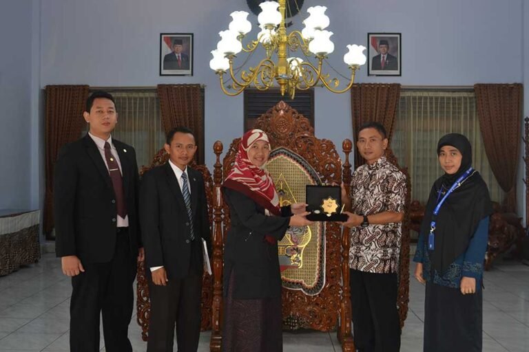 Direktur Lazis Tazakka, Hj. Eva Mariah Ulfah, S.Ag., M.Si (tengah) didampingi Wakil Pimpinan PM Tazakka, Ustadz Bisri Mustofa, S.H.I., M.Si (dua dari kiri) menyerahkan cinderamata kepada Bupati Batang Yoyok Riyo Sudibyo usai penyampaian laporan dan progra